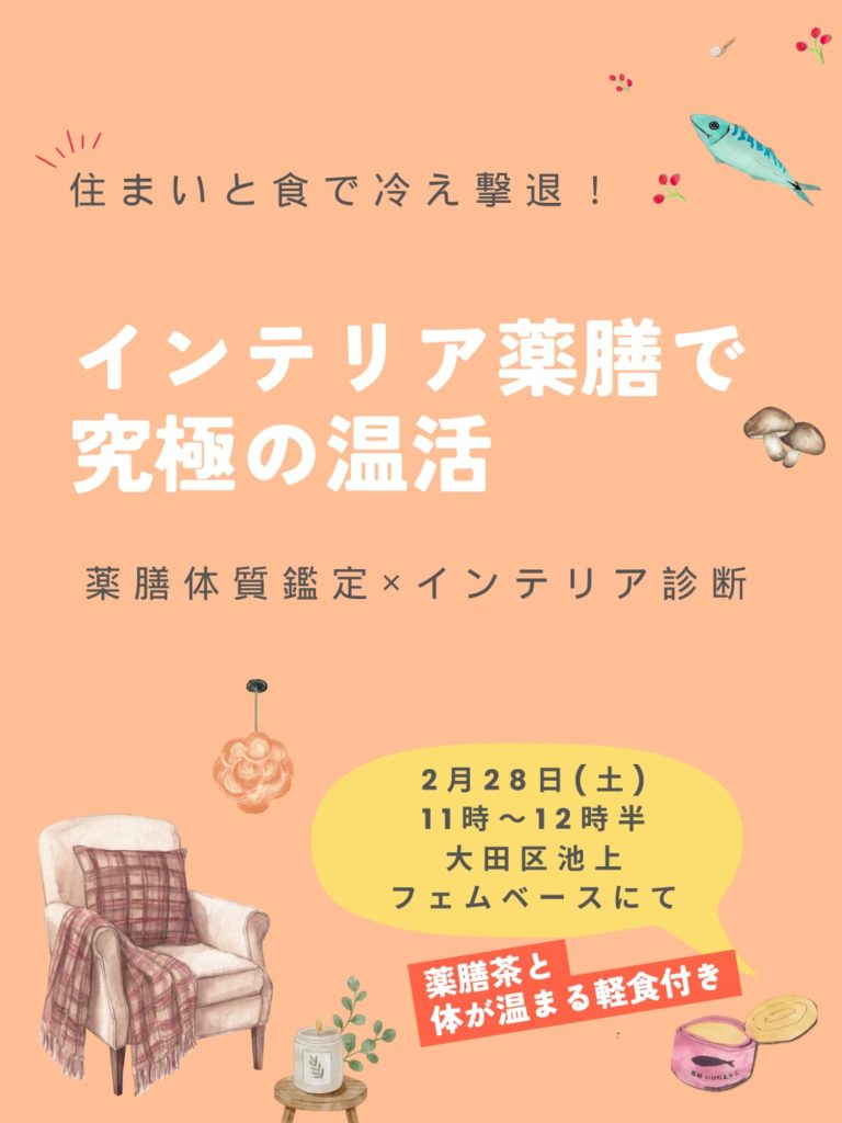 食養生に加えて、中医学(中国伝統医学)の観点を加味しながら、心理学に基づいたインテリアで、不調改善効果が倍増!昨年、目黒区商工祭りのイベントで大好評だった企画を本格的に実施いたします。